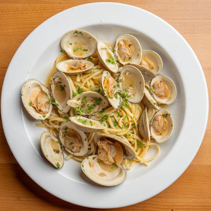 Entrée-Clams, Mussels, Shrimp, Salmon, linguini garlic white wine & basil.
