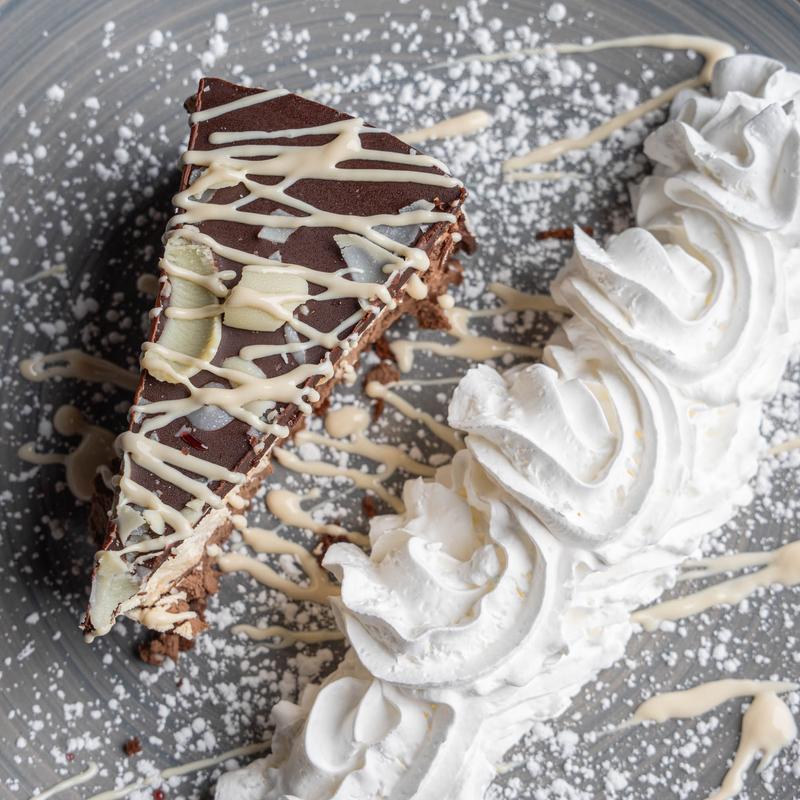 Dessert – Chocolate mousse cake with raspberry sauce, fresh berries.